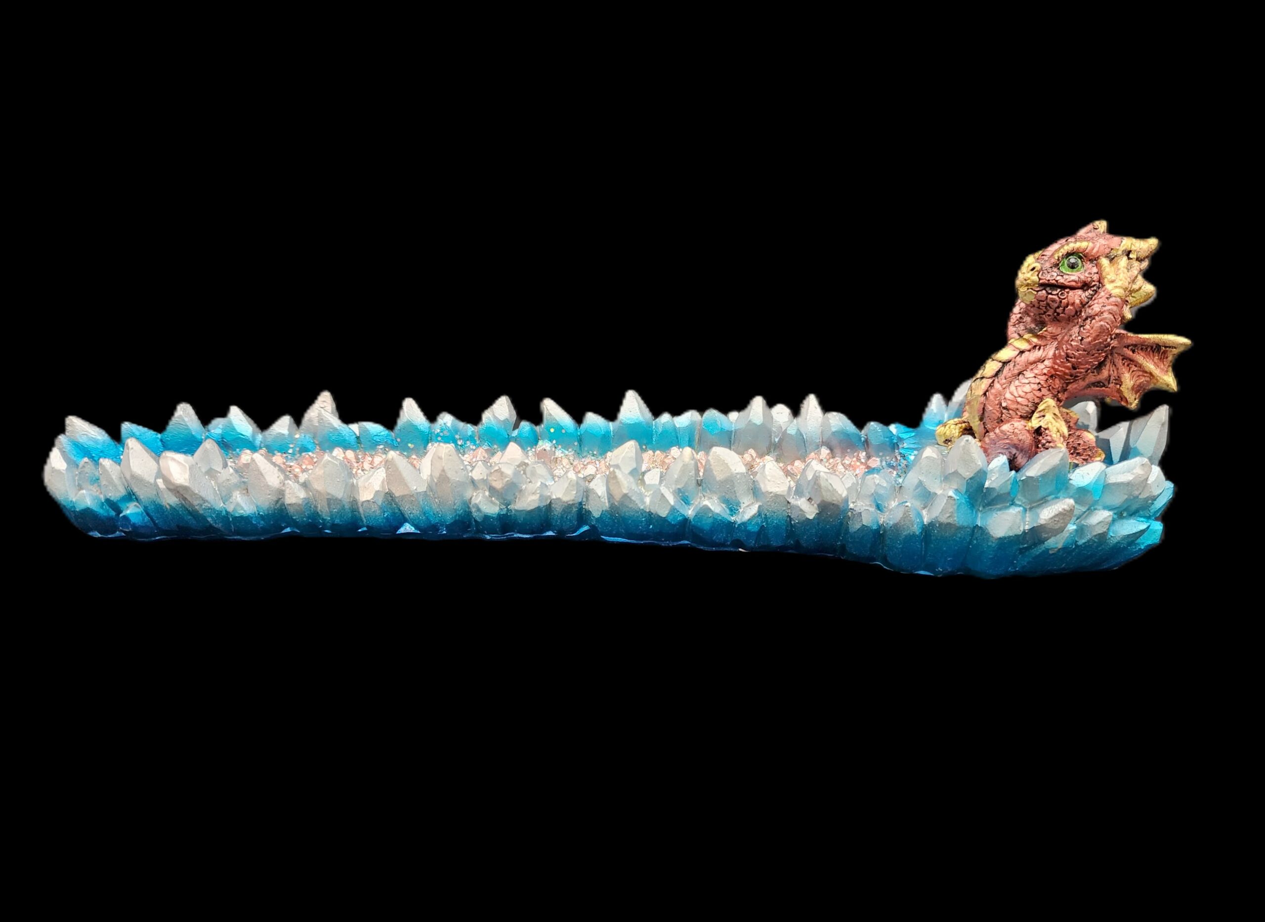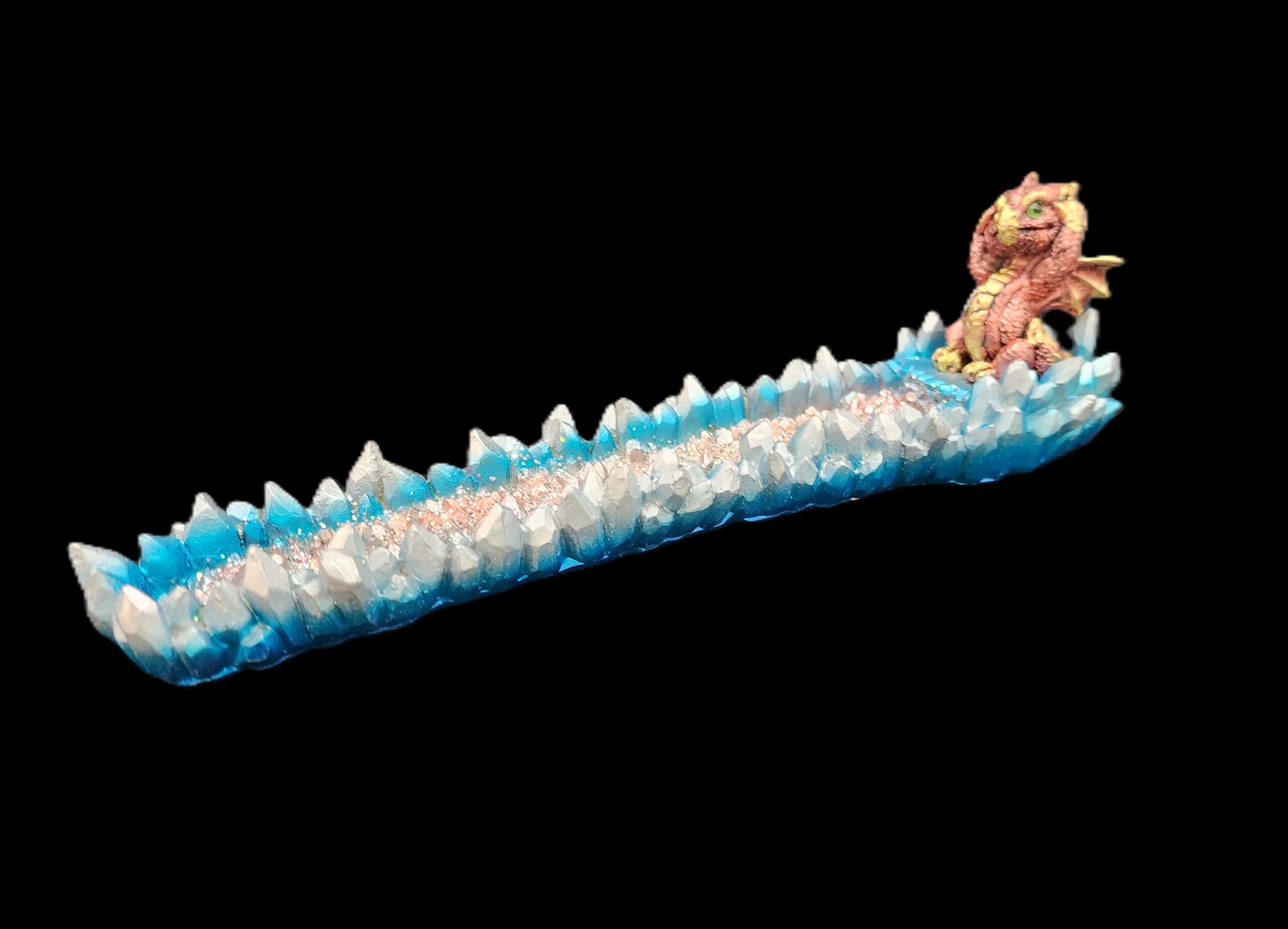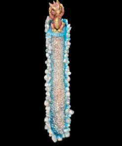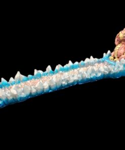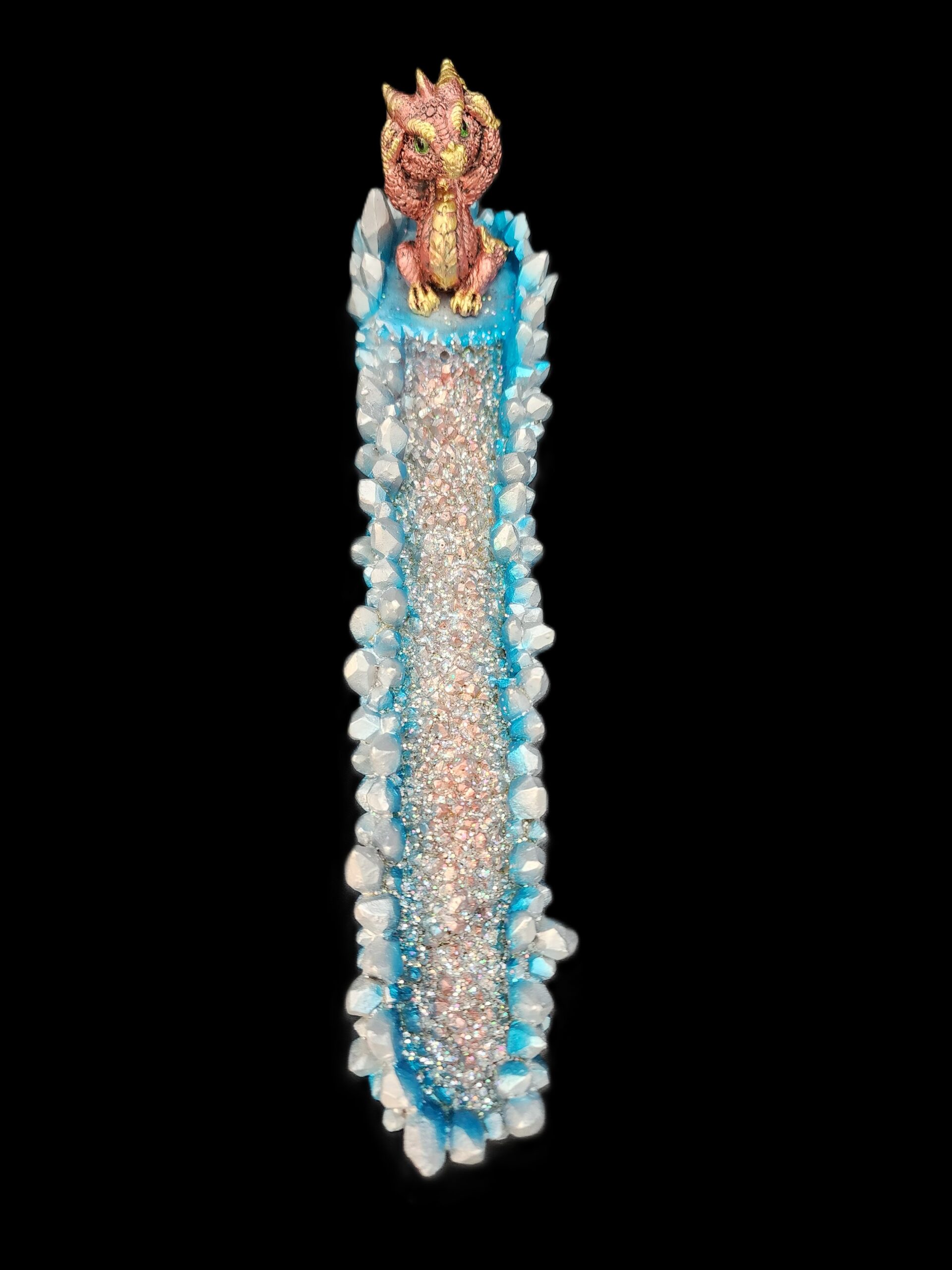 12.5″ Hand-decorated incense burner. A mischievous little dragon sits proudly among crystal spires, guarding your incense like it’s treasure. The red glittered base catches the light as the smoke drifts past, creating a scene that feels equal parts adorable and enchanted. A perfect companion for anyone who enjoys fantasy with a playful edge.