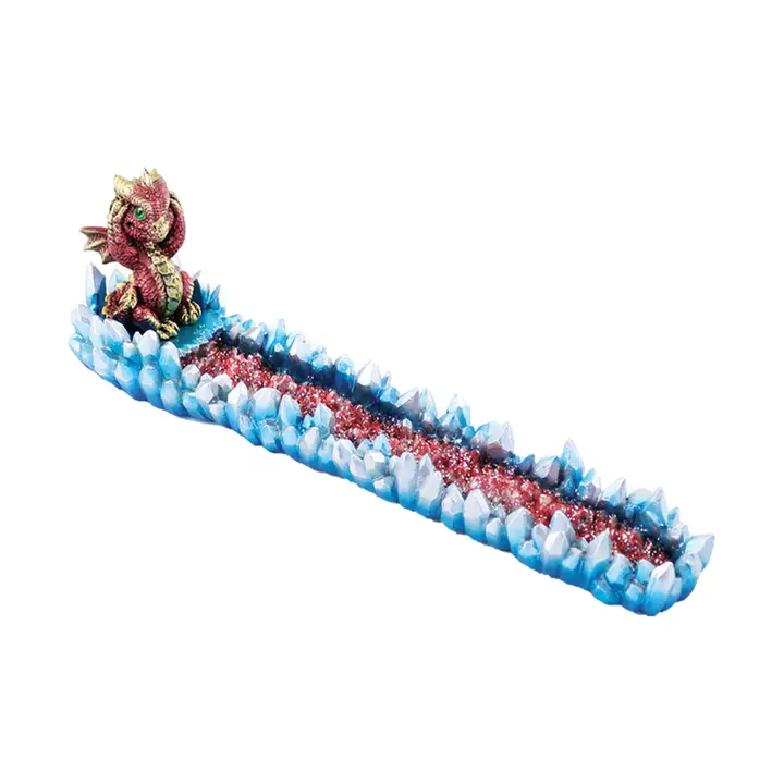 A playful baby dragon sits among crystal peaks, guarding a glittering red incense tray. Magical, bright, and perfect for fantasy lovers.
