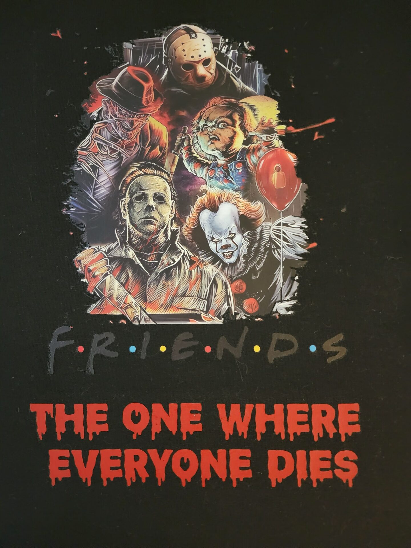 For the horror fan who grew up on sitcom reruns and slasher marathons, this T‑shirt is the crossover you didn’t know you needed. Featuring your favourite murder icons posing like a wholesome TV cast, it delivers the perfect punchline: “The One Where Everyone Dies.” It’s a wicked twist on classic episode titles, blending cozy nostalgia with unapologetic carnage. Whether you’re a die‑hard horror buff, a Friends fanatic with a dark streak, or someone who just appreciates a good genre mashup, this shirt is your new go‑to. Equal parts creepy and comforting — like binge‑watching your favorite killers with a bowl of popcorn and questionable life choices.