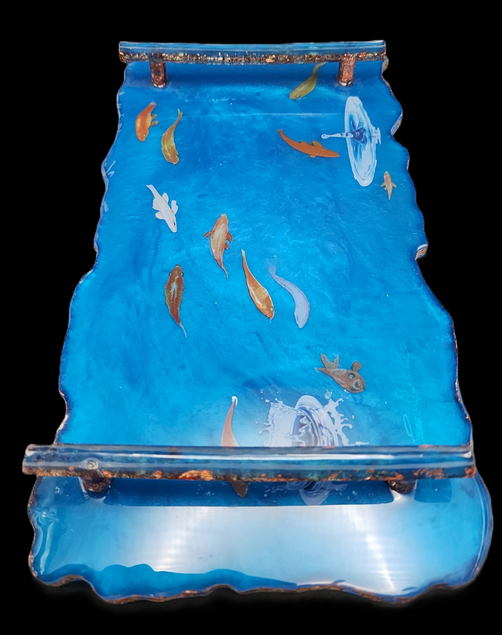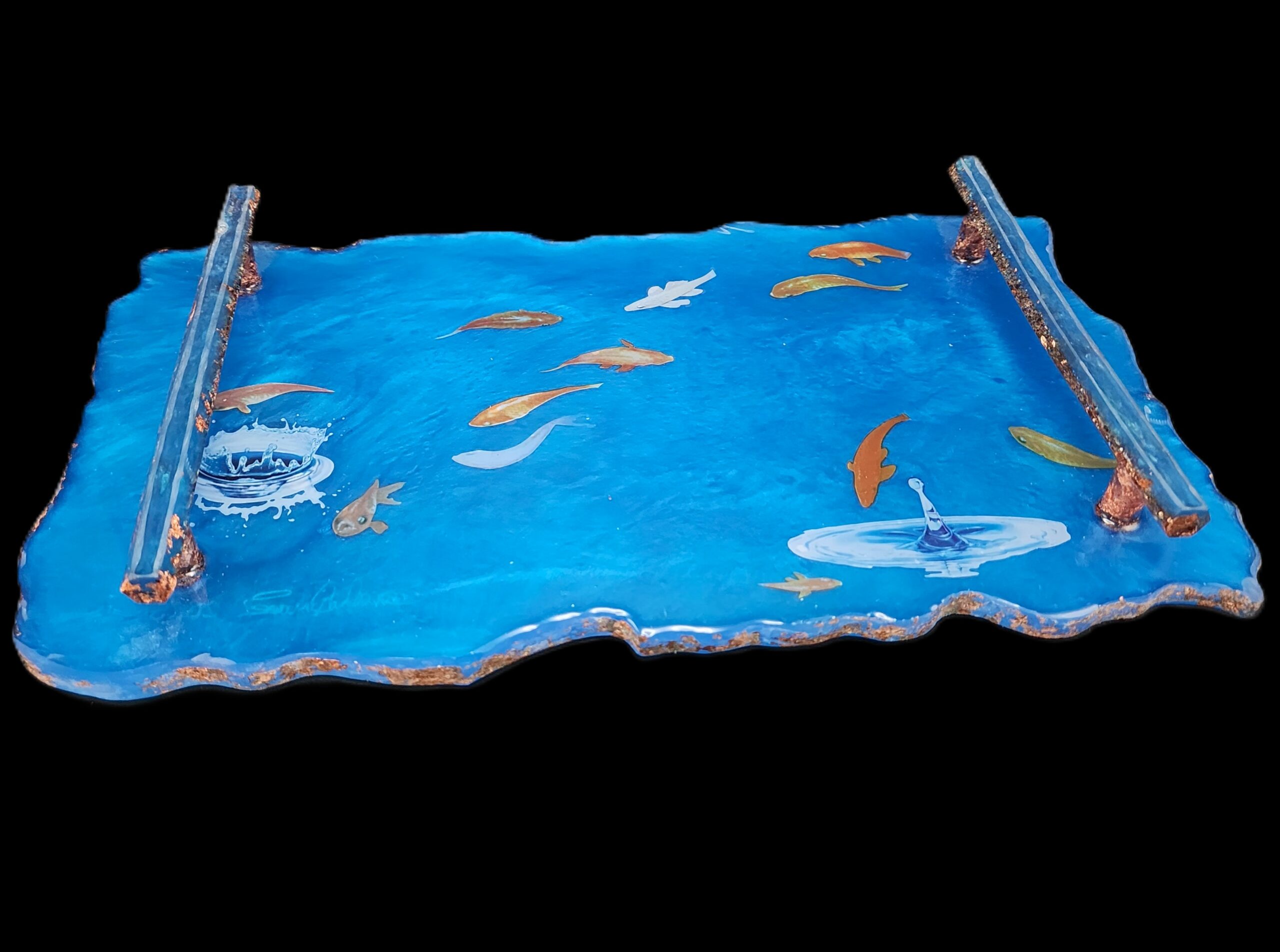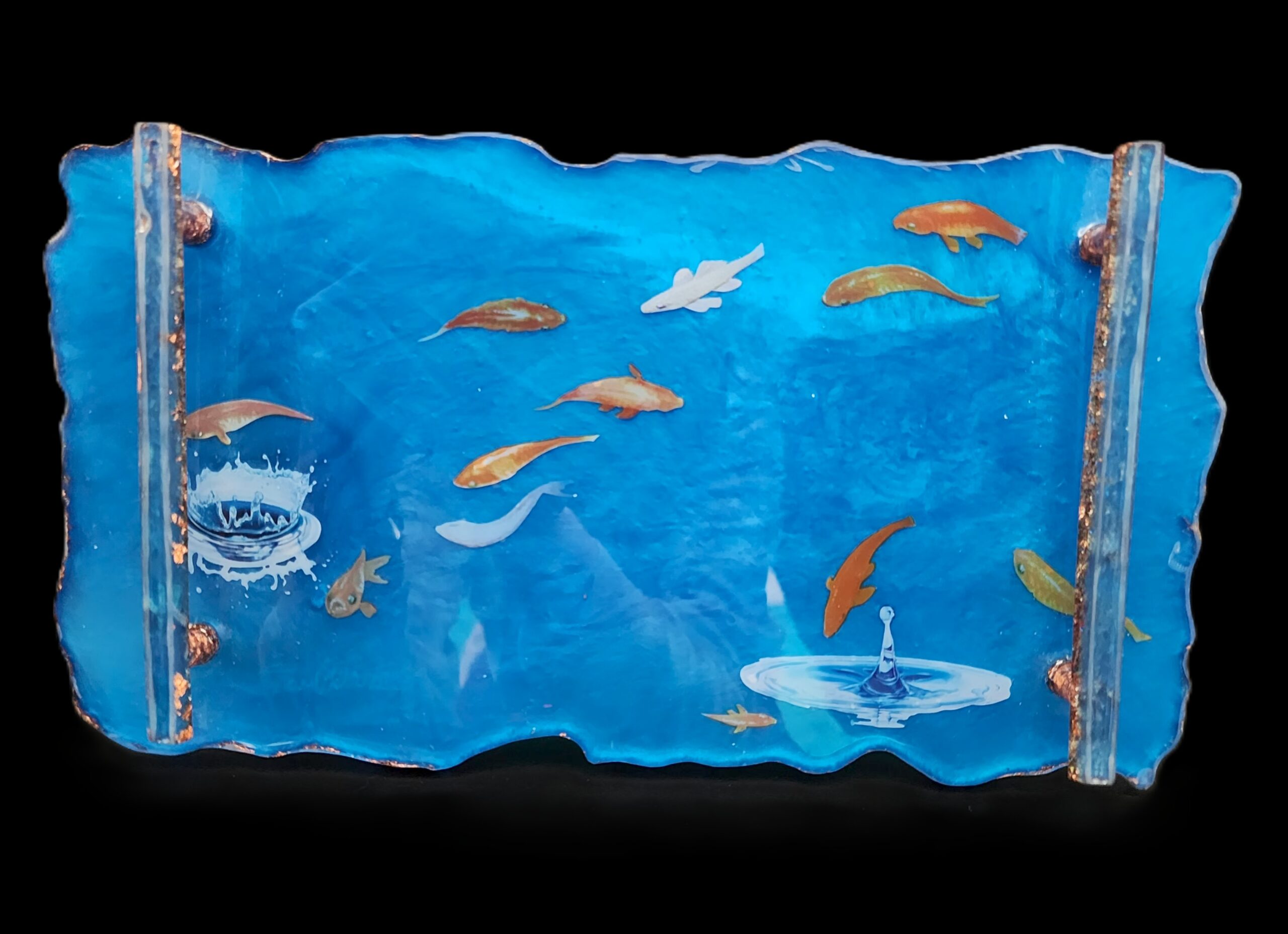 This handmade vanity tray brings a peaceful koi pond to life in vivid blues and shimmering depth. Colorful koi glide through swirling water, captured mid‑motion in a glossy, sculpted surface that feels like a moment frozen beneath glass. With sturdy side handles and a smooth finish, it’s perfect for holding hand soaps, toothbrushes, perfumes, jewelry — or anything else that needs a beautiful place to land. A calming, functional piece that adds a splash of serenity to any space.