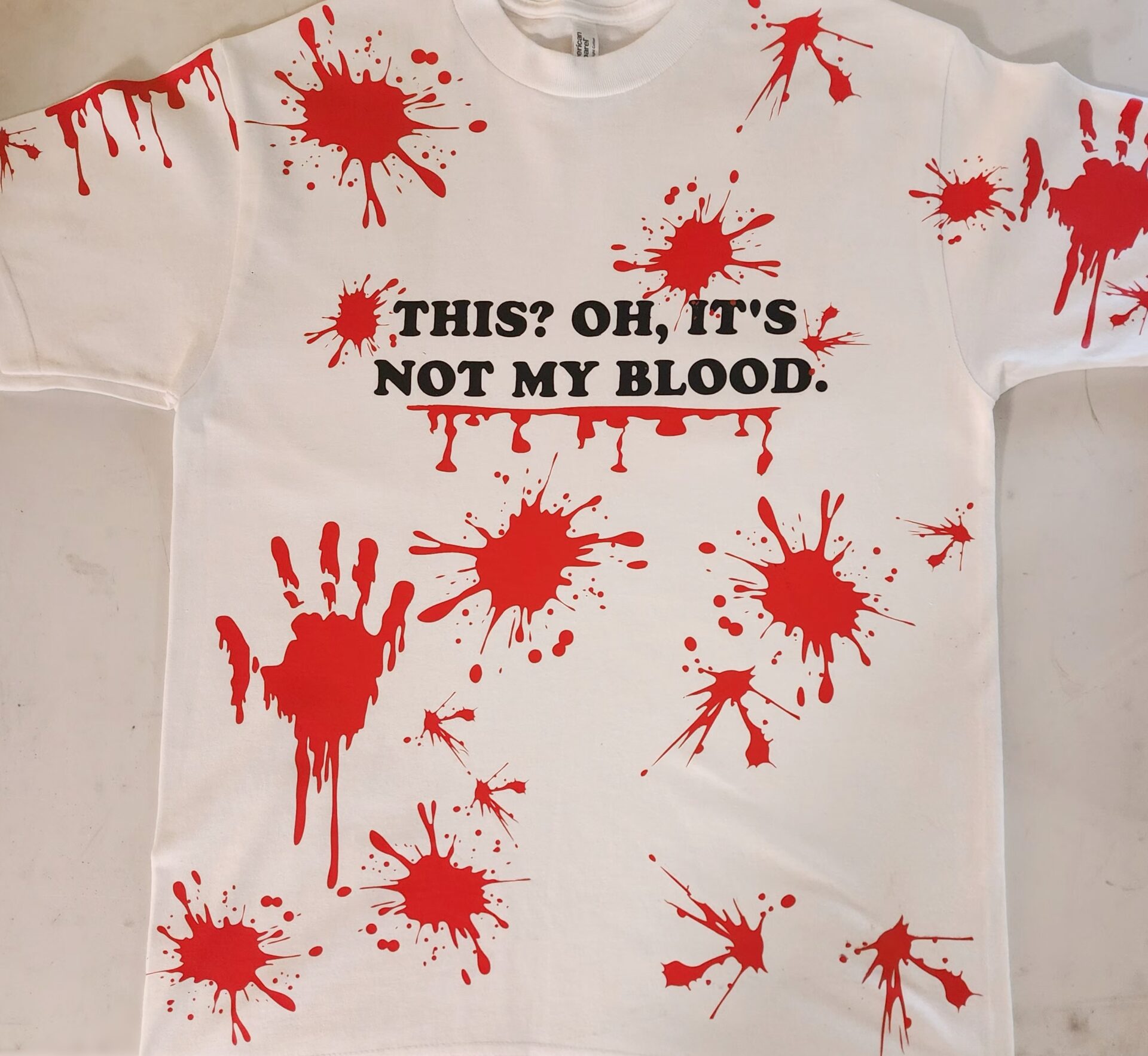 This T‑shirt is for the beautifully unbothered — the kind of person who can stroll through Fresno or Clovis with suspicious red splatters and a smile. Featuring bold lettering that reads “THIS? OH, IT’S NOT MY BLOOD.” and a delightfully chaotic splatter pattern, this design blends dark humor with unapologetic attitude.